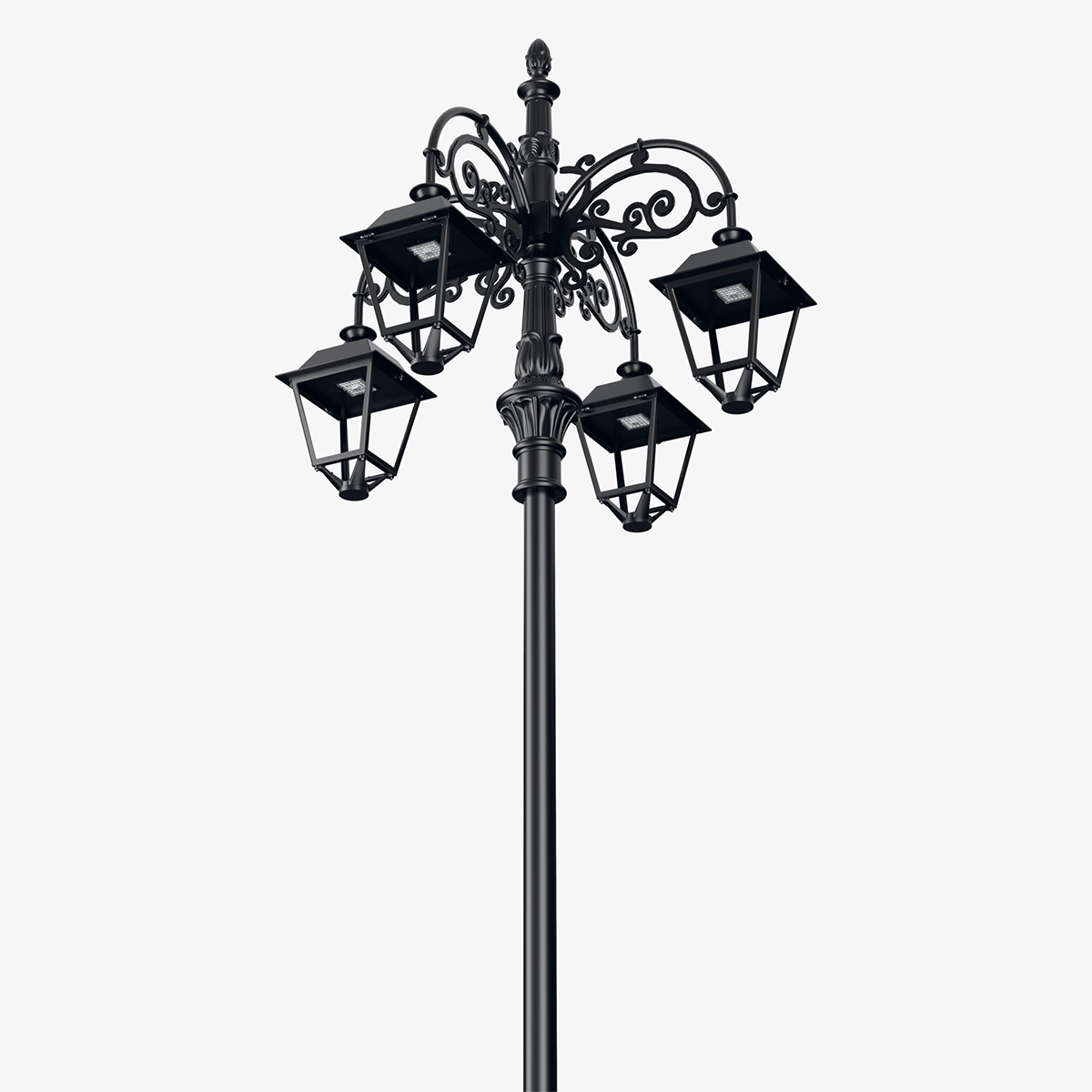 Citadel presents a strong and balanced silhouette inspired by classical urban lighting, creating a distinct presence in public spaces. Its four-arm supporting structure and symmetrically positioned top lighting elements enhance the horizontal emphasis, giving the design a monumental and orderly character.