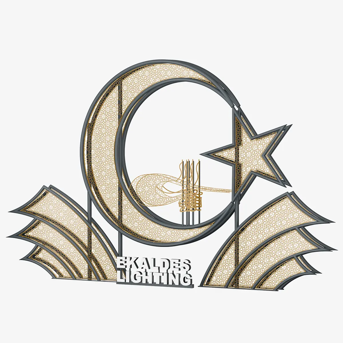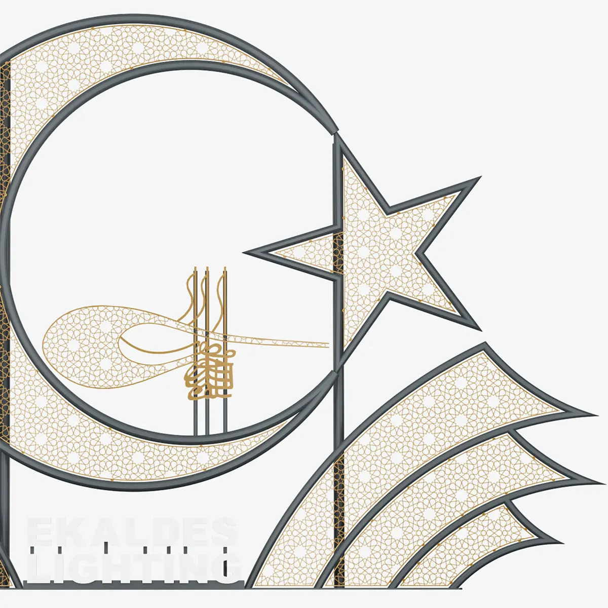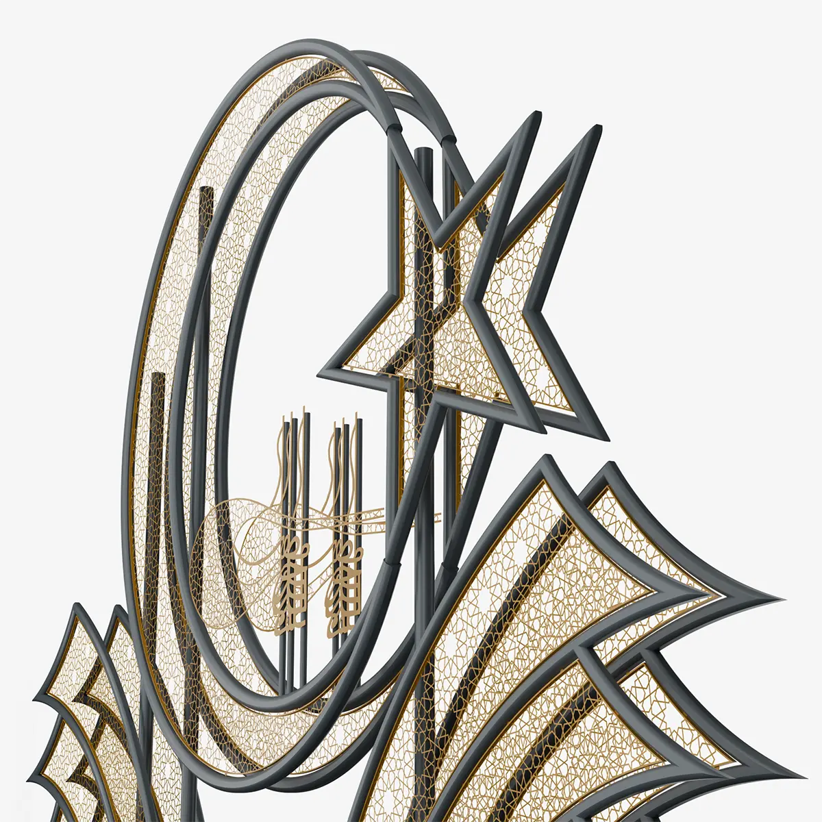 The layered composition of symbolic forms transforms the design into a strong focal element at the urban scale. Light highlights the internal structure of the form, adding visual depth.