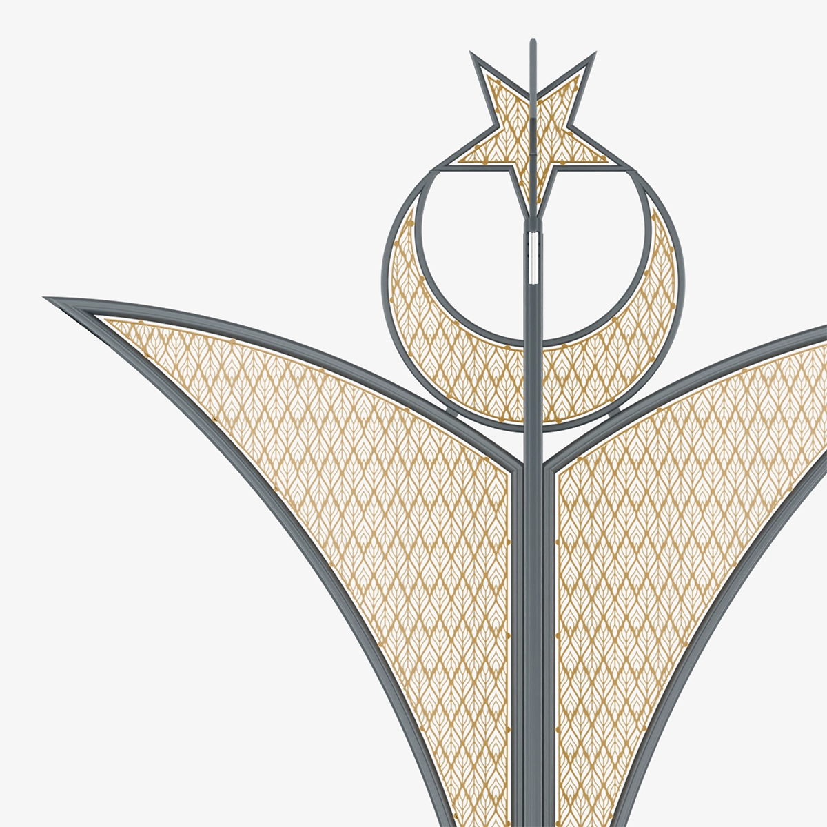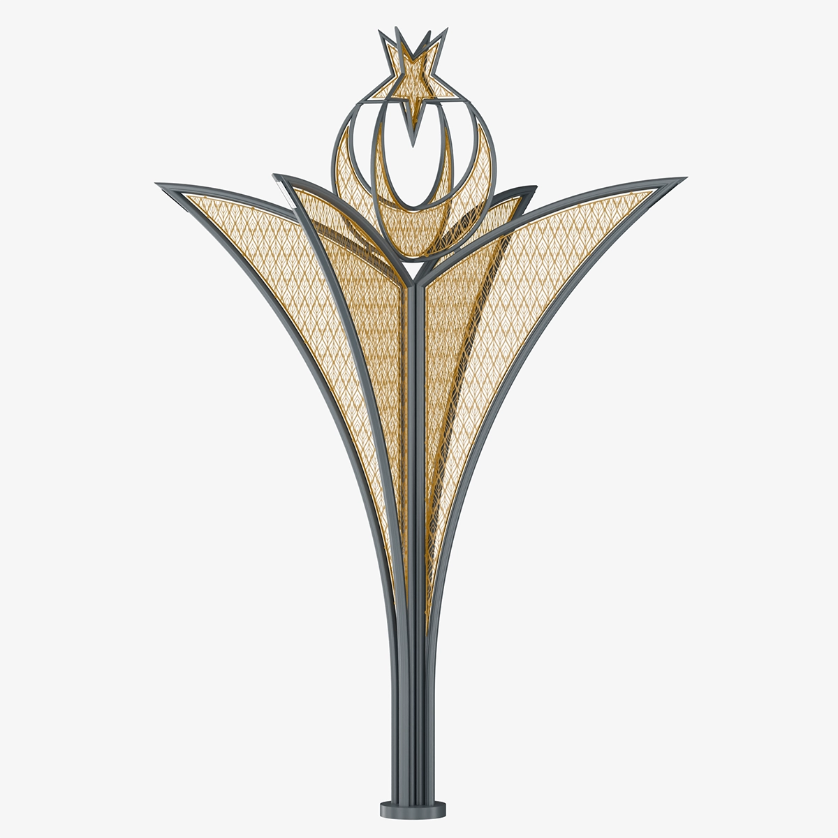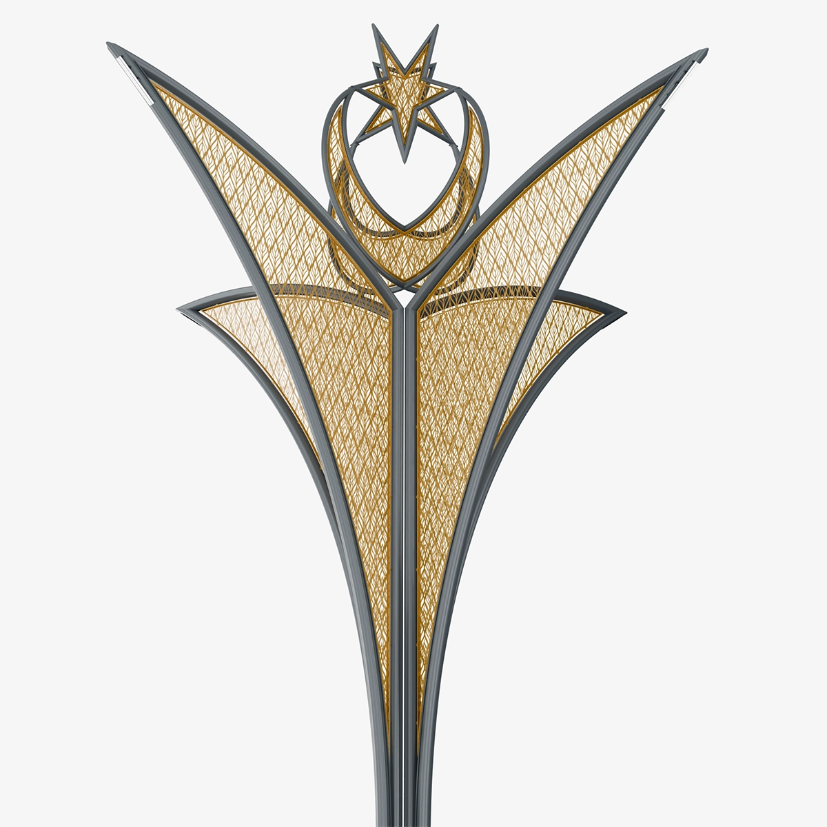 The proportion established between the vertical support and the expanding upper forms visually elevates the design. The lighting reinforces this proportion, transforming the structure into a spatial focal point.