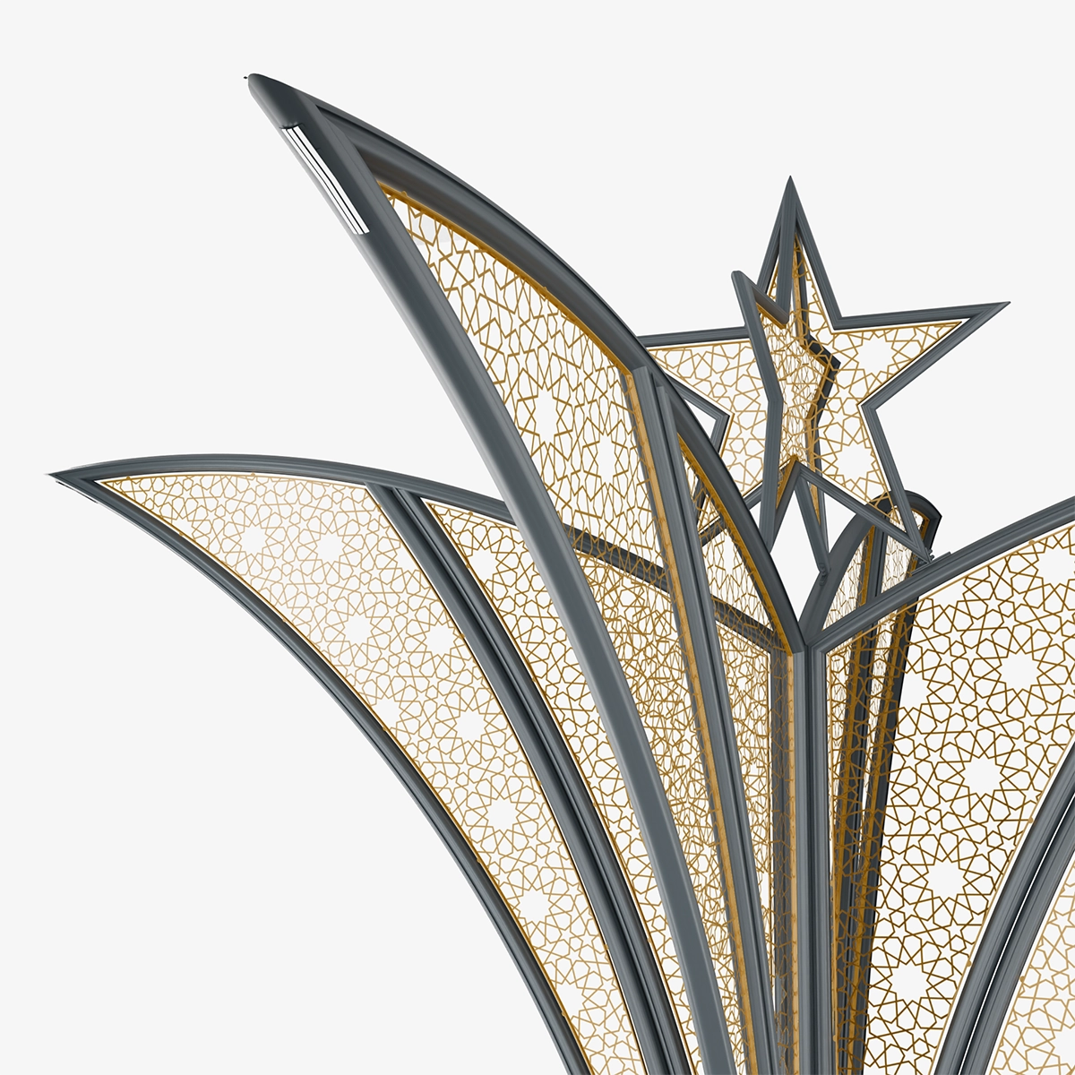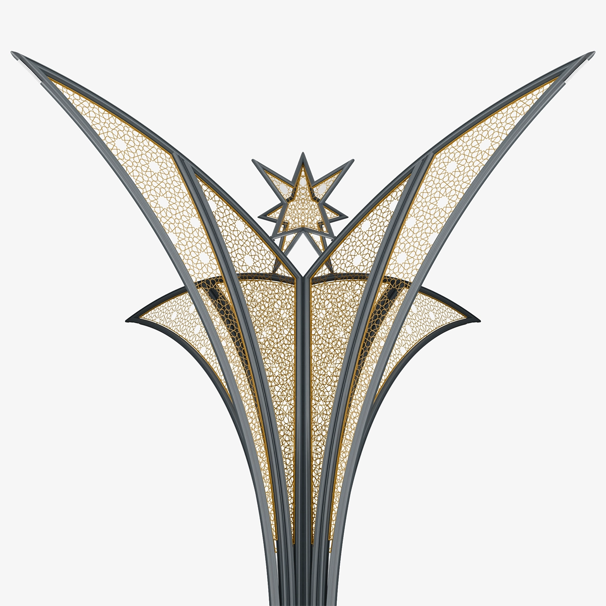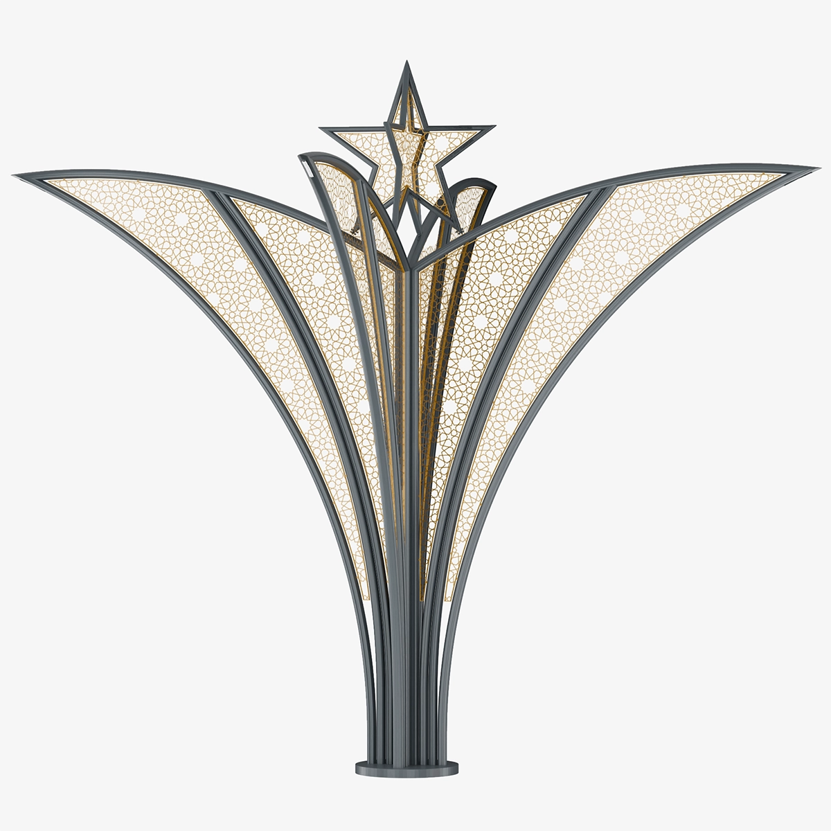 Its form, expanding upward from the center, creates a strong and balanced silhouette at the urban scale. The permeable surface gains depth with light, transforming the design into a focal urban element.