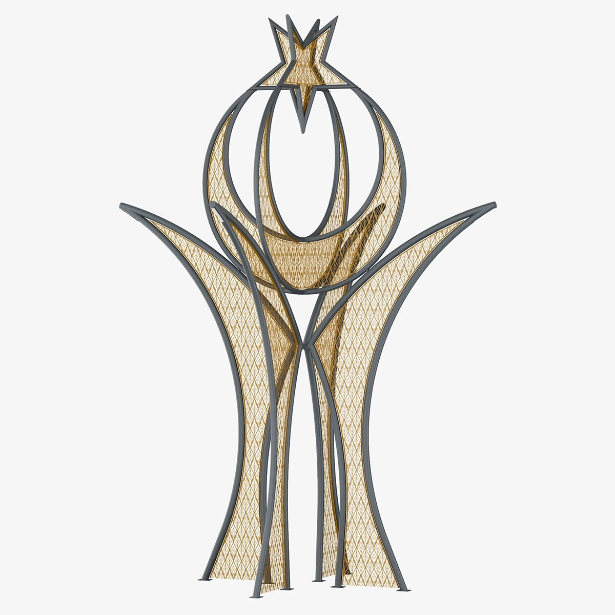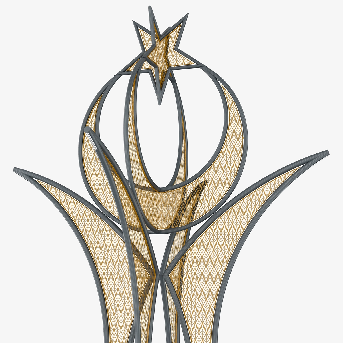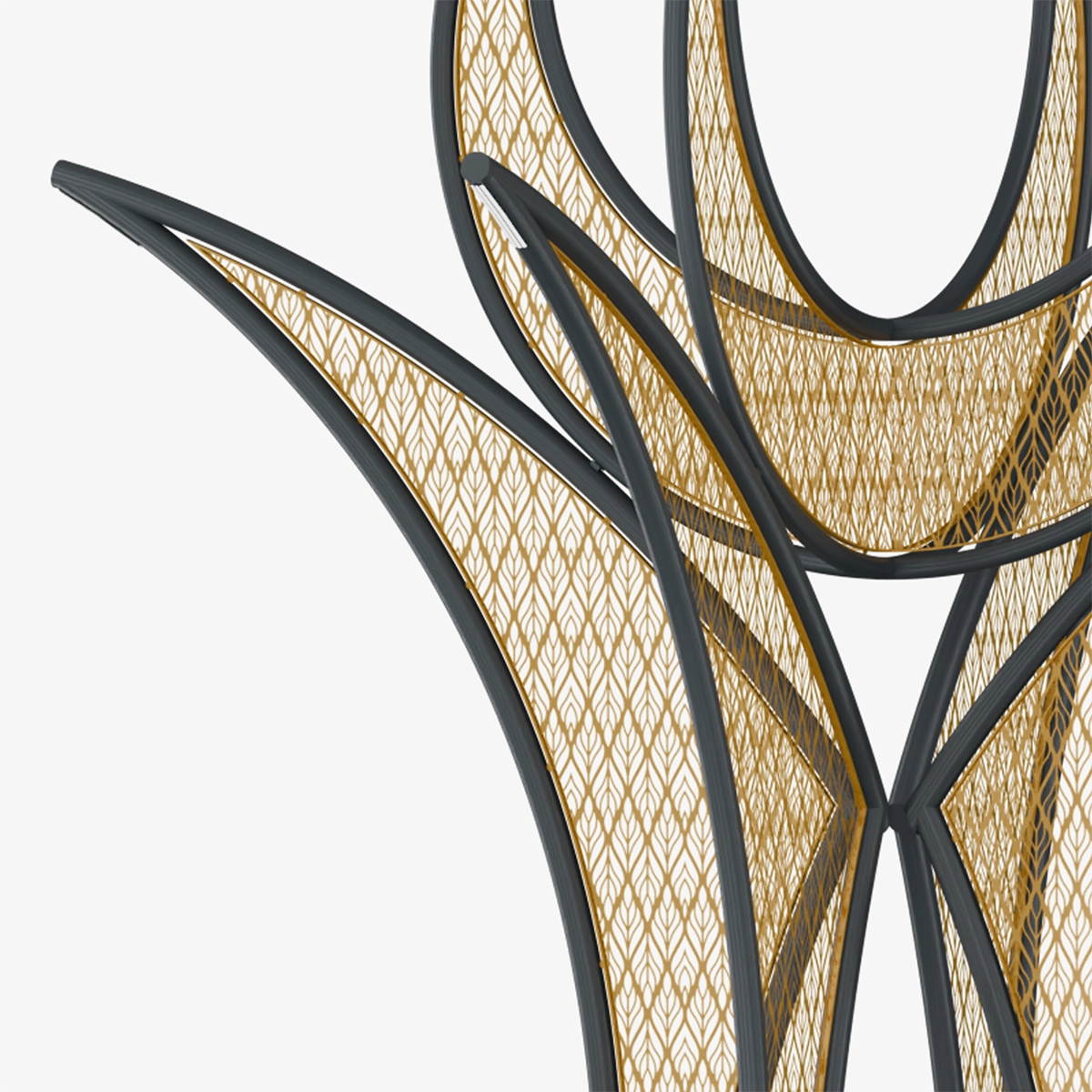 The upward-opening curved lines give the structure a fluid and monumental character. The lighting reveals the internal rhythm of the form, enhancing spatial perception.