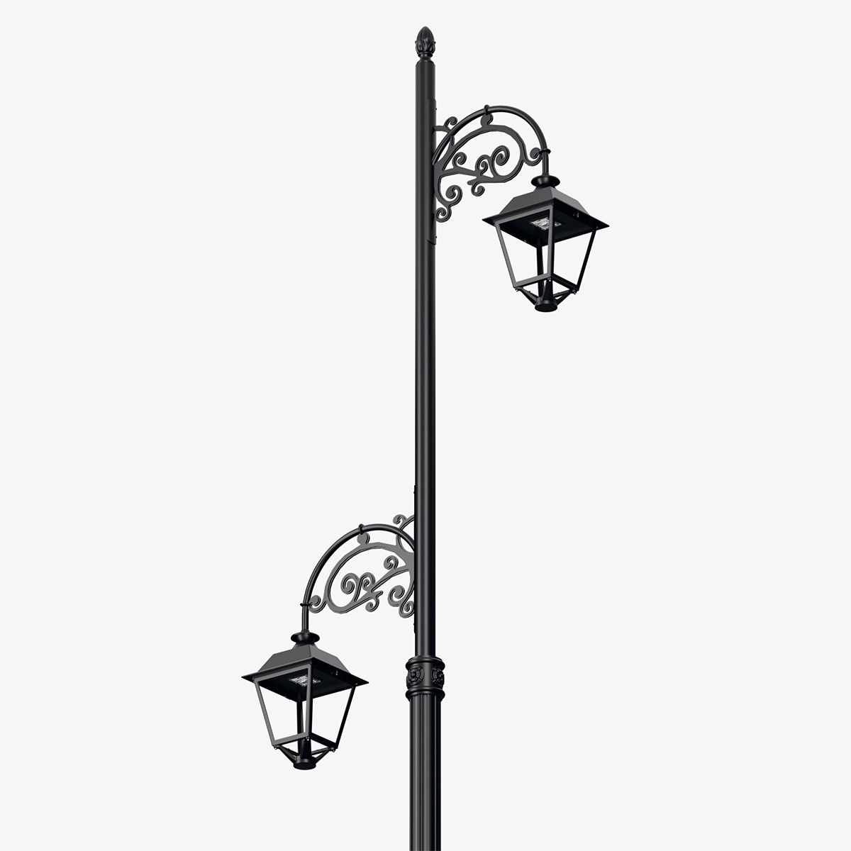Legacy offers a timeless aesthetic in public spaces with its balanced and decorative silhouette inspired by classic urban lighting. Its double-arm supporting structure with flowing lines and symmetrically positioned lighting elements emphasizes both horizontal and vertical impact, giving the design a strong and distinctive presence.