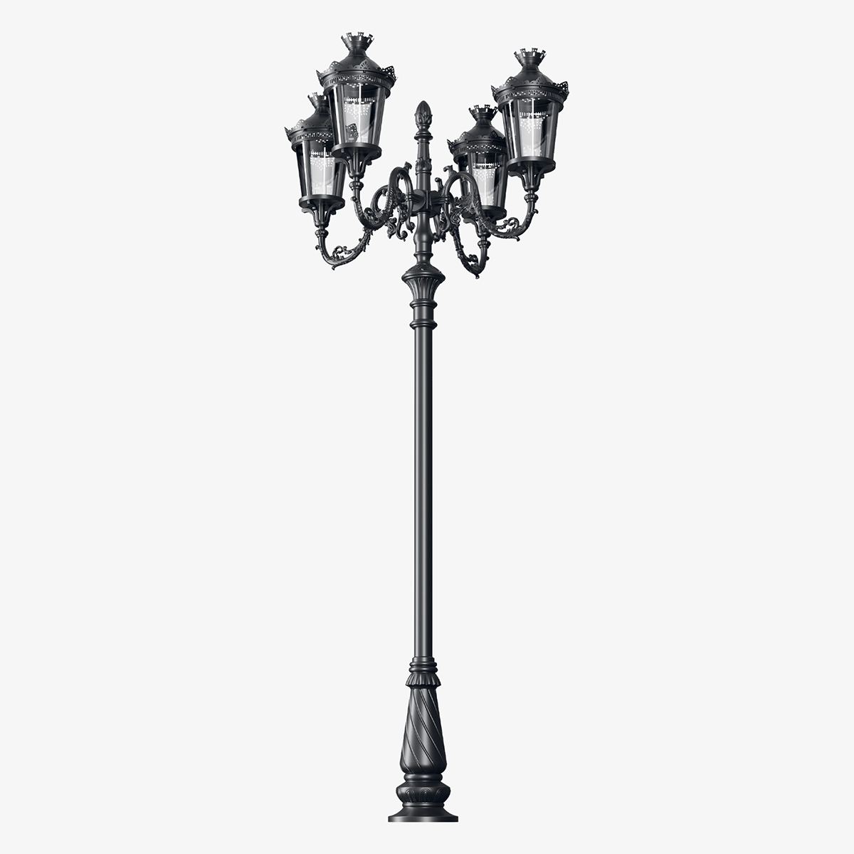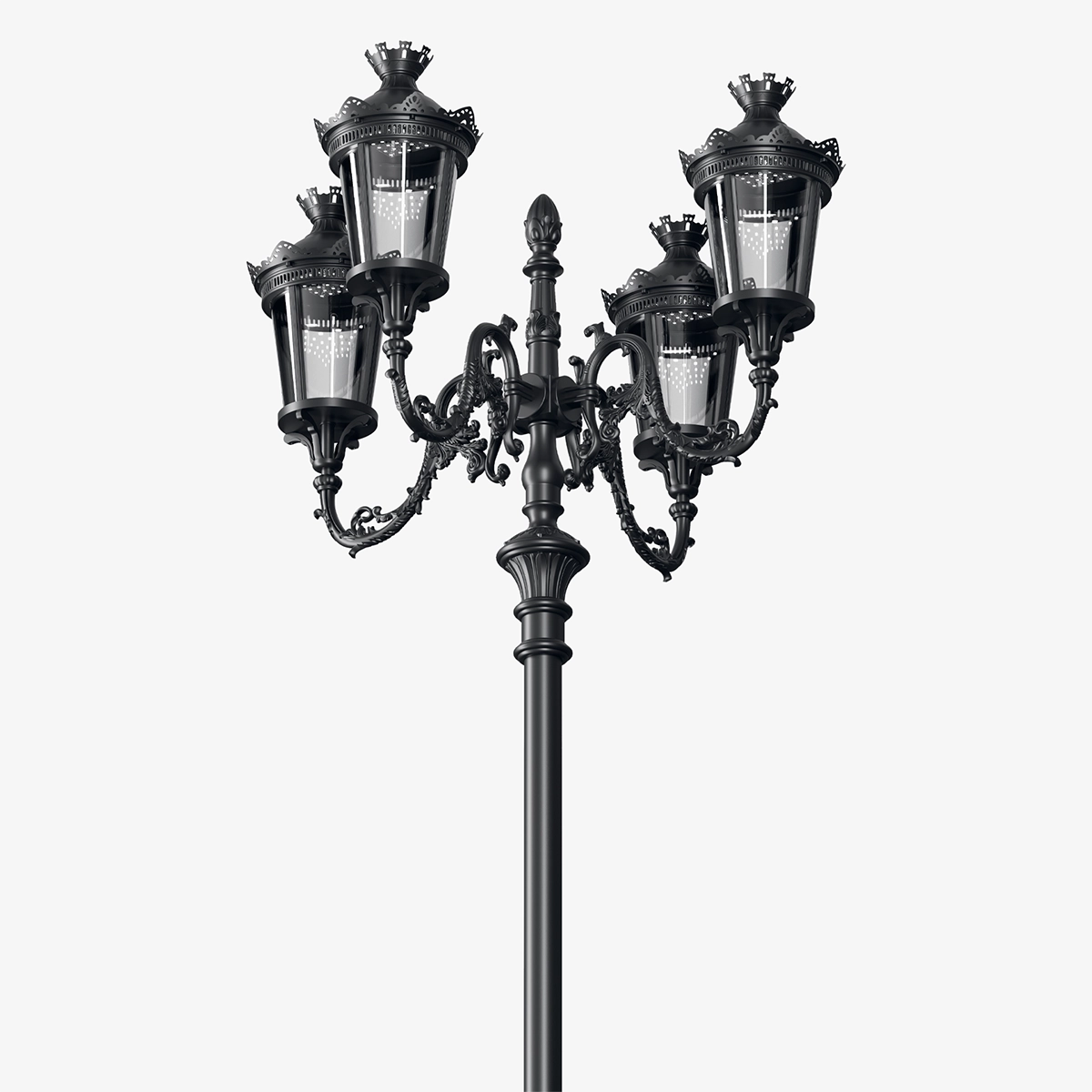 Lumen creates a strong and balanced silhouette in public spaces with its decorative form inspired by classical urban lighting. Its four-arm supporting structure with flowing lines and symmetrically positioned lighting elements emphasizes the horizontal effect, giving the design an elegant and distinctive appearance.