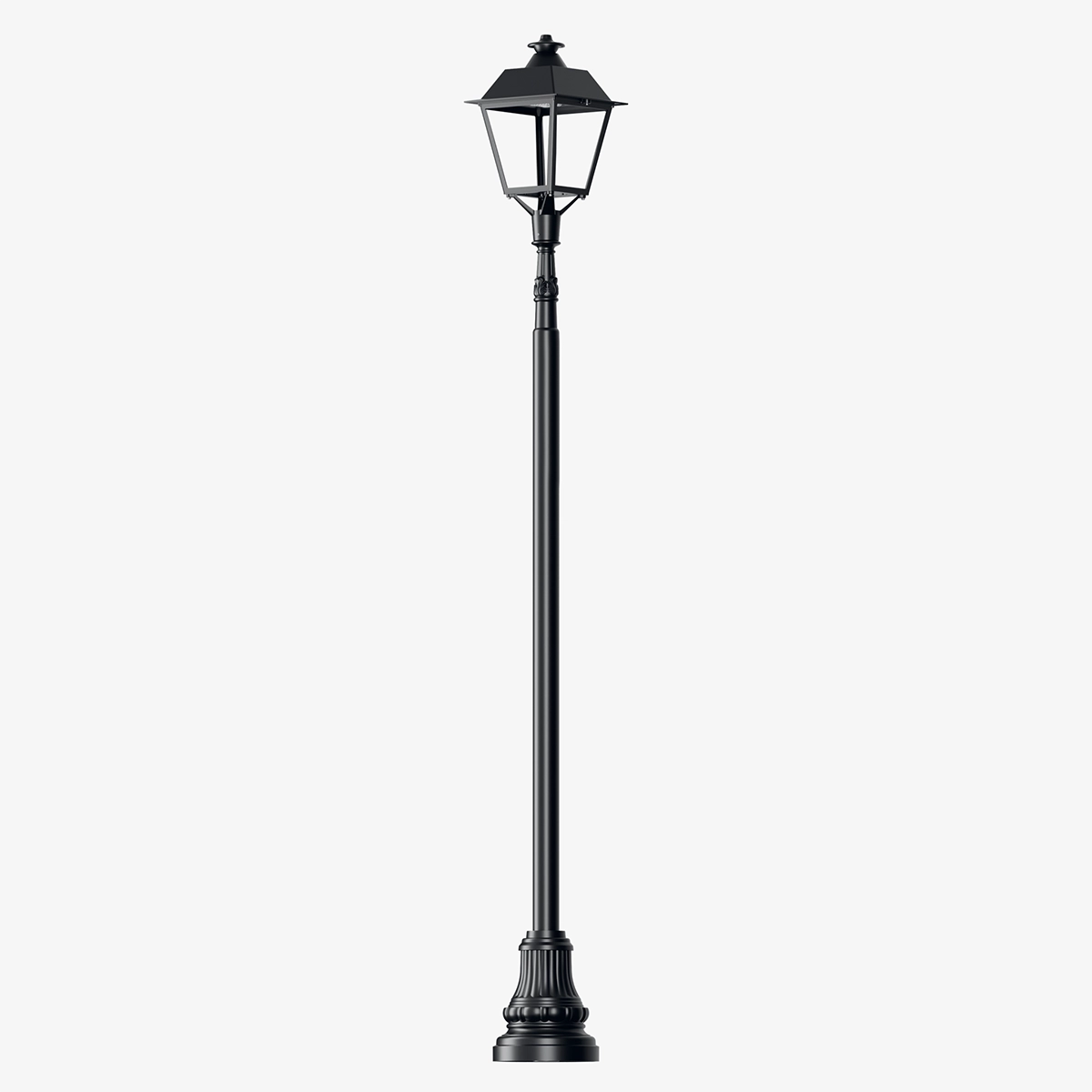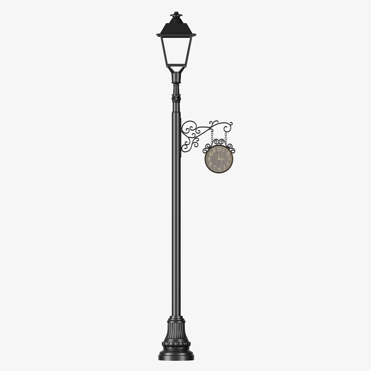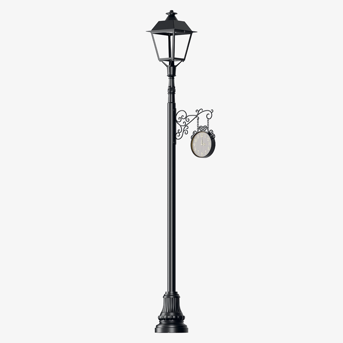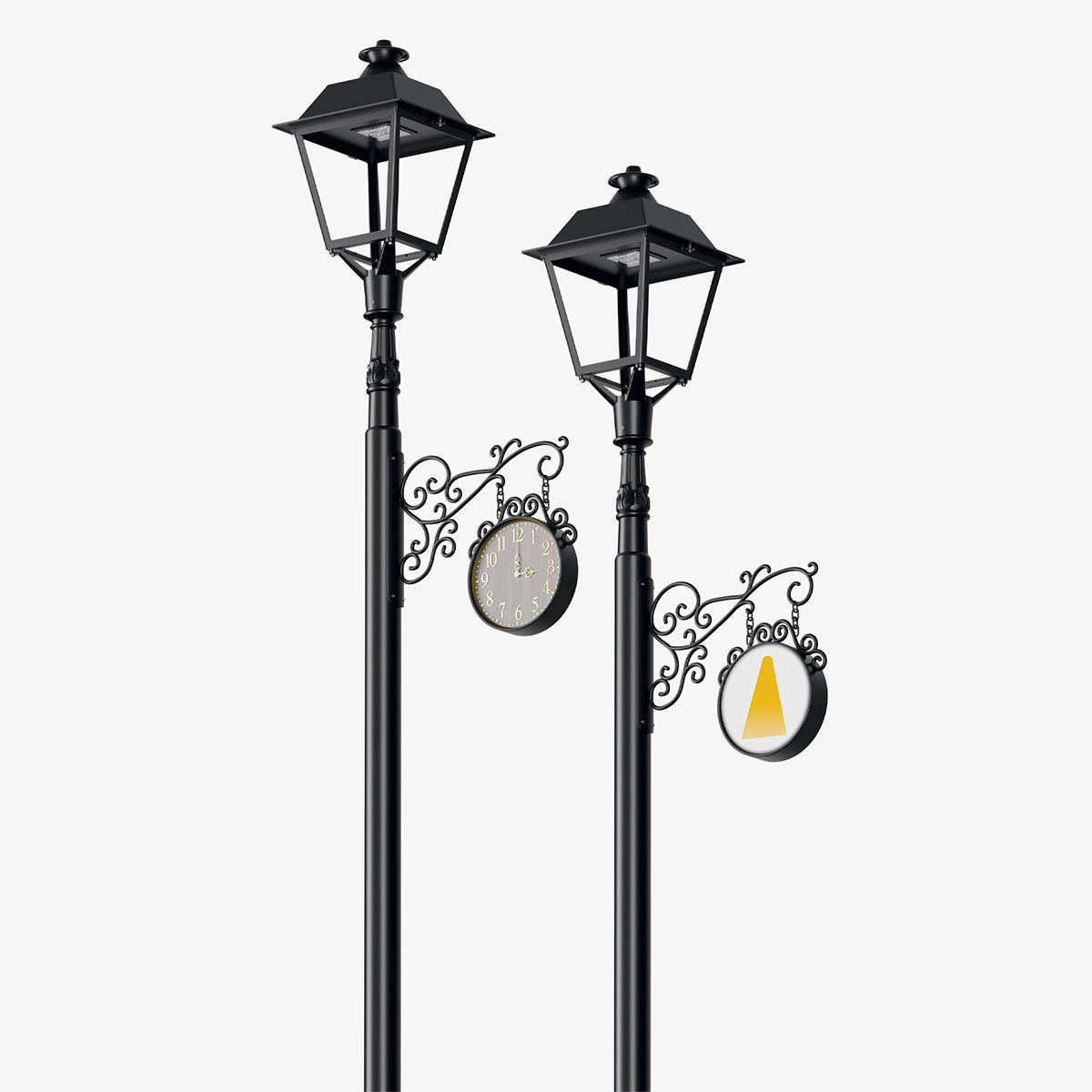 Vicolo brings a timeless character to the urban fabric with its elegant form inspired by classical street lighting. Its slender, well-proportioned body and top lighting element enhance the vertical emphasis, while the clock or logo on the side arm adds a distinctive identity to the design.